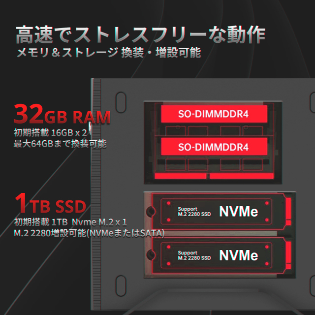 メモリは最大64GBまで換装可能。M.2 2280空きスロットが1つあるため、対応したストレージの増設も行えます。*初期搭載RAM16GB x 2。M.2スロットはNVMe&SATAに対応しています。