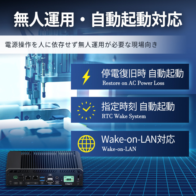 BIOS設定を行わなくても、簡単かつ確実に無人運用や遠隔電源管理が可能です。