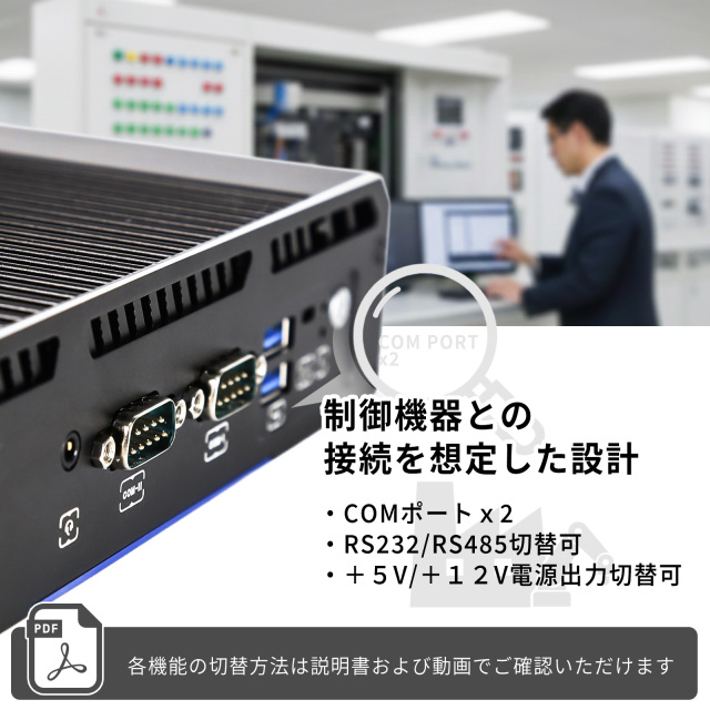 各COMポートは RS-232 / RS-485 をジャンパーで切替可能で、より幅広い産業機器や通信規格に対応します。