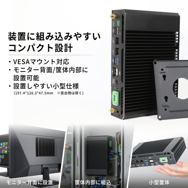| インターフェース | USB3.0×4、USB2.0×2、HDMI×1、DisplayPort×1、LAN×2、COM(RS23 2/RS485)×2、AUDIOコンボジャック×1、DC12V入力×1、フェニックス端子