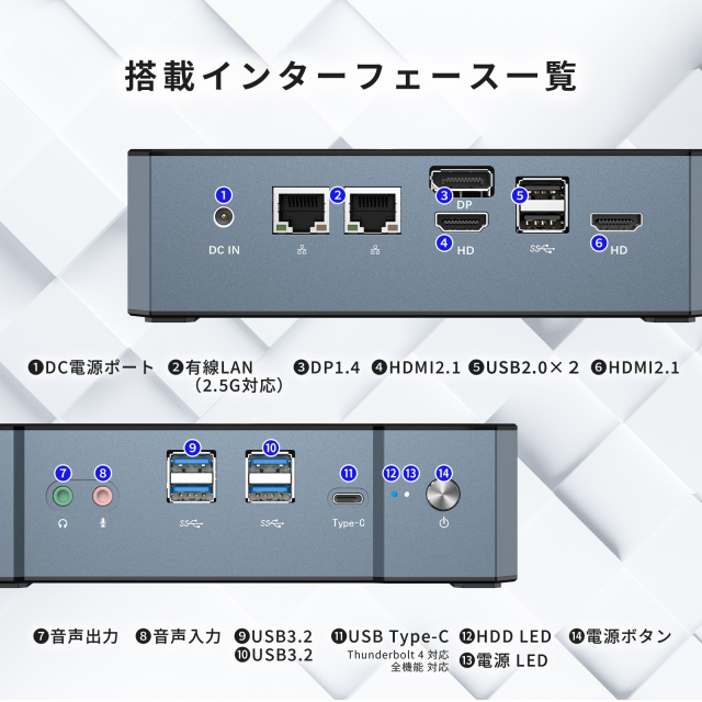 | インターフェース | USB3.2×4、USB2.0×2、HDMI 2.1×2、DisplayPort 1.4 ×1 Type-C (フル機能対応)×1、LAN×2、音声出力x1、音声入力x1、DC12V入力×1 |