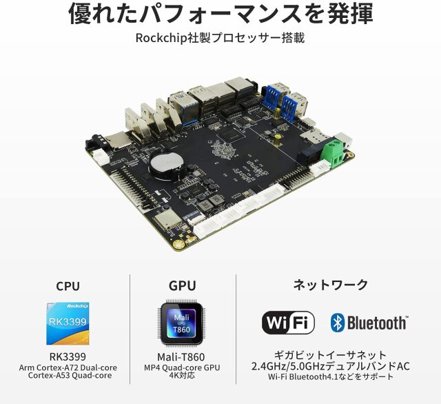 | CPU | 強力なマシンパワーを発揮するRK3399。BigコアにCortex-A72、LITTLEコアにCortex-A53を搭載しています。 |