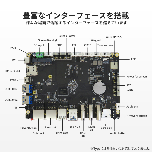 | 映像出力 | ●HDMI OUT(4K)×1 ●HDMI OUT(2K)×1●eDP×1.Support 3.3V/5V/12V ●LVDS×1 |